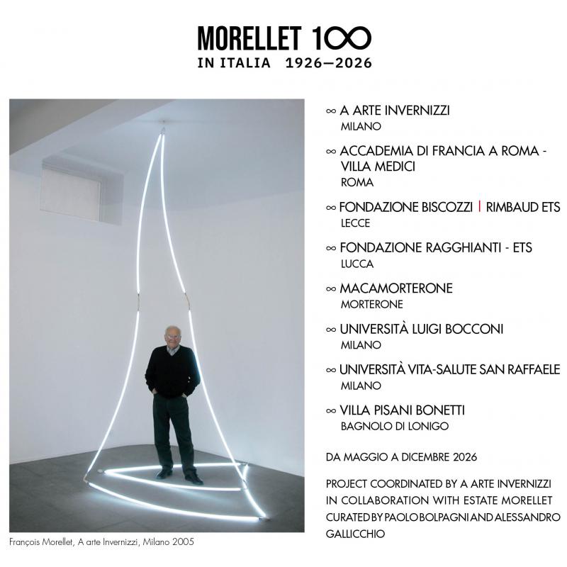 Il progetto ∞François Morellet∞ Centenario in Italia 1926 - 2026, ideato e coordinato dalla galleria A arte Invernizzi, curato da Paolo Bolpagni, direttore della Fondazione Ragghianti di Lucca, e Alessandro Gallicchio, direttore del Dipartimento di storia dell’arte dell’Accademia di Francia a Roma - Villa Medici, e realizzato in stretta collaborazione con l’Estate Morellet, è stato pensato in occasione del centenario di François Morellet (1926 - 2016).