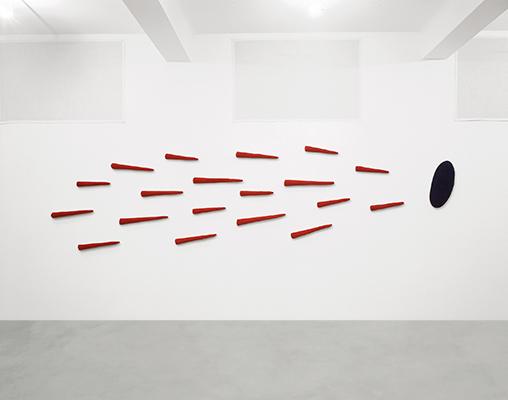 Nelle sue “Pitture” il rapporto tra gli elementi e l’ambiente circostante acquisisce il valore di un’indagine sia spaziale che percettiva, come emerge nei lavori esposti al piano inferiore della galleria. Ogni frammento crea una diversa dinamicità rispetto alla superficie toccata e, nel proprio insieme, l’opera costruisce tracciati, percorsi e andamenti allusivi. Come scrive Giorgio Verzotti “la pittura diviene indice di spazialità, diventa funzione di un’indagine spaziale che dinamizza le superfici toccate dall’intervento, che costruisce percorsi, andamenti, indica direzioni, allude a margini e confini e dunque a virtuali scompaginazioni e riassestamenti ambientali. [...] Ad un al-di-là solo evocato però corrisponde un qui-e-ora altamente enfatizzato nella sua presenza al senso. Ciò si manifesta fin dall’inizio, col creare una pittura che scambia alcune delle sue caratteristiche decisive con la scultura. Nata da un fare concreto (pensare è fare e fare è pensare, è un po’ il motto dell’artista) l’opera dipinta viene sospesa nella dimensione ambigua del bassorilievo, sulla soglia fra due identità canoniche. E d’altra parte l’apertura allo spazio non avviene, non può avvenire, solo sulla dimensione del piano. La pittura ha un corpo plastico, attestato dall’atto costruttivo su cui si fonda, che si offre alla percezione”.