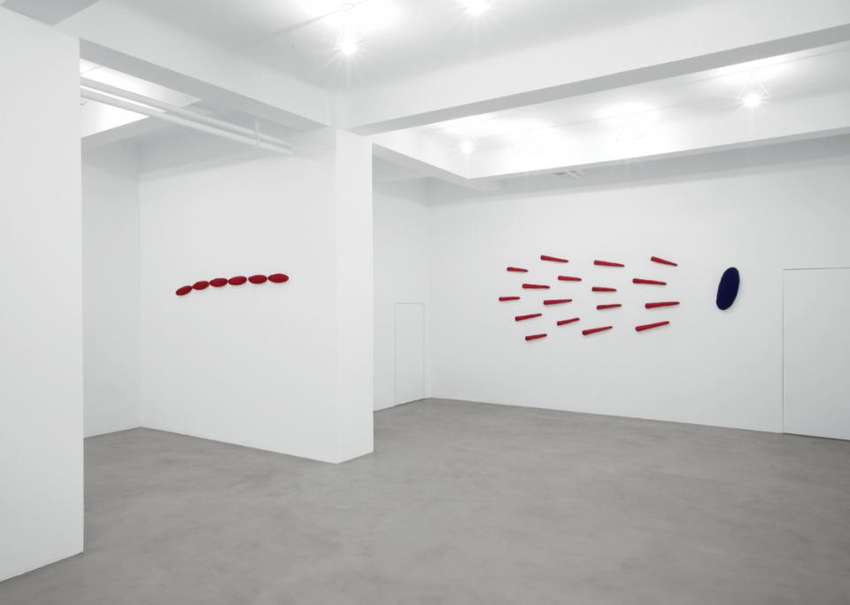 Nelle sue “Pitture” il rapporto tra gli elementi e l’ambiente circostante acquisisce il valore di un’indagine sia spaziale che percettiva, come emerge nei lavori esposti al piano inferiore della galleria. Ogni frammento crea una diversa dinamicità rispetto alla superficie toccata e, nel proprio insieme, l’opera costruisce tracciati, percorsi e andamenti allusivi. Come scrive Giorgio Verzotti “la pittura diviene indice di spazialità, diventa funzione di un’indagine spaziale che dinamizza le superfici toccate dall’intervento, che costruisce percorsi, andamenti, indica direzioni, allude a margini e confini e dunque a virtuali scompaginazioni e riassestamenti ambientali. [...] Ad un al-di-là solo evocato però corrisponde un qui-e-ora altamente enfatizzato nella sua presenza al senso. Ciò si manifesta fin dall’inizio, col creare una pittura che scambia alcune delle sue caratteristiche decisive con la scultura. Nata da un fare concreto (pensare è fare e fare è pensare, è un po’ il motto dell’artista) l’opera dipinta viene sospesa nella dimensione ambigua del bassorilievo, sulla soglia fra due identità canoniche. E d’altra parte l’apertura allo spazio non avviene, non può avvenire, solo sulla dimensione del piano. La pittura ha un corpo plastico, attestato dall’atto costruttivo su cui si fonda, che si offre alla percezione”.