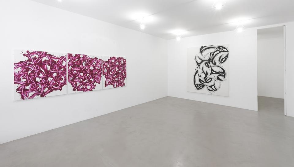 Works such as Camurro (1981) and Diodiavolo (1980) reveal tangles, contortions, sudden somersaults - traces that oscillate between forceful, penetrating gestures and marks that thin out and dissipate as they expand from their chromatic matrix, rigorously black. This bursts across the surface only to transform and liberate its intrinsic energy. So then, as the years went by, in works like Aggroblanda (1984), Bestia (1985), and Zaazze (1986), all included in the exhibition - the trace of each mark became regular in an even more in-depth, precise system of coordinates. Moving away from informal gestures, it recomposes itself in a system in which the mark thins out and, eventually, becomes an autonomous entity. It is now a tubular form that opens onto spaces of fullness and void, into which the white of the surface is inserted, ultimately emerging as a body in itself.