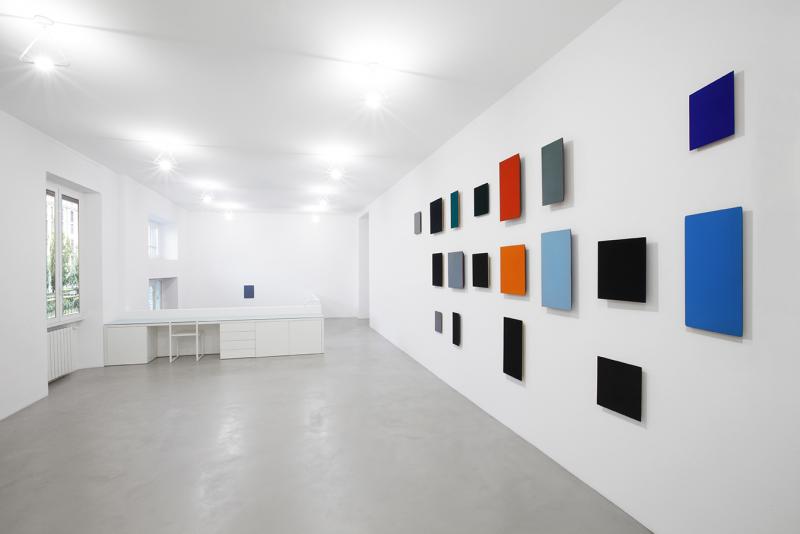 The upper floor of the gallery hosted an installation consisting of monochromatic works placed at precise intervals on the wall, orchestrating and redefining its spatial coordinates. In the next room on the same floor, there were select works from the 1970s, consisting of two wooden panels placed next to each other and entirely covered in black pigment.