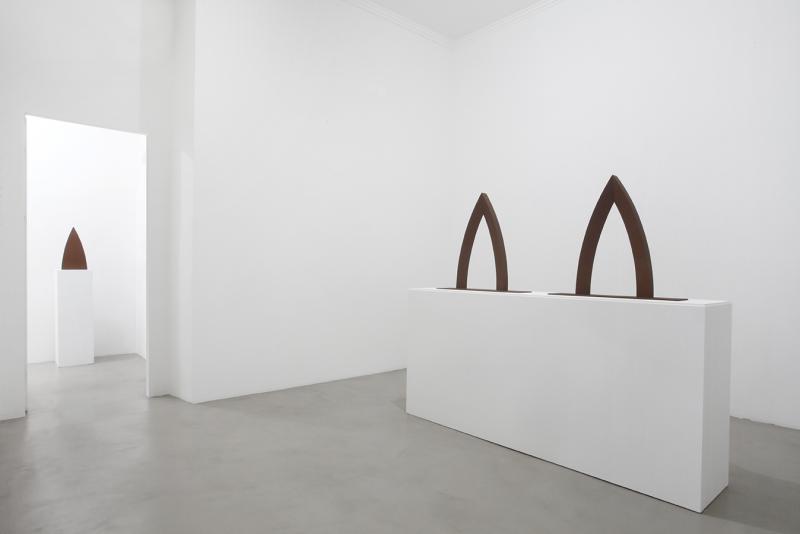 Three series of works in weathering steel are shown upstairs: their sculptural forms recall famous works created in public spaces, interacting with their settings. These include the “intervention sculpture” consisting of an inverted arch designed for the opening of the Luigi Pecci Centre for Contemporary Art and for the Olympic village in Seoul. Then there is the crescent-shaped work created for the Fridericianum in Kassel in 1988 and now reconfigured to a design by the artist in the Intesa Sanpaolo – Gallerie d’Italia collections in Milan. Lastly, we find the ellipse that recalls the Primi passi [First Steps] work created in Volterra in 2009.